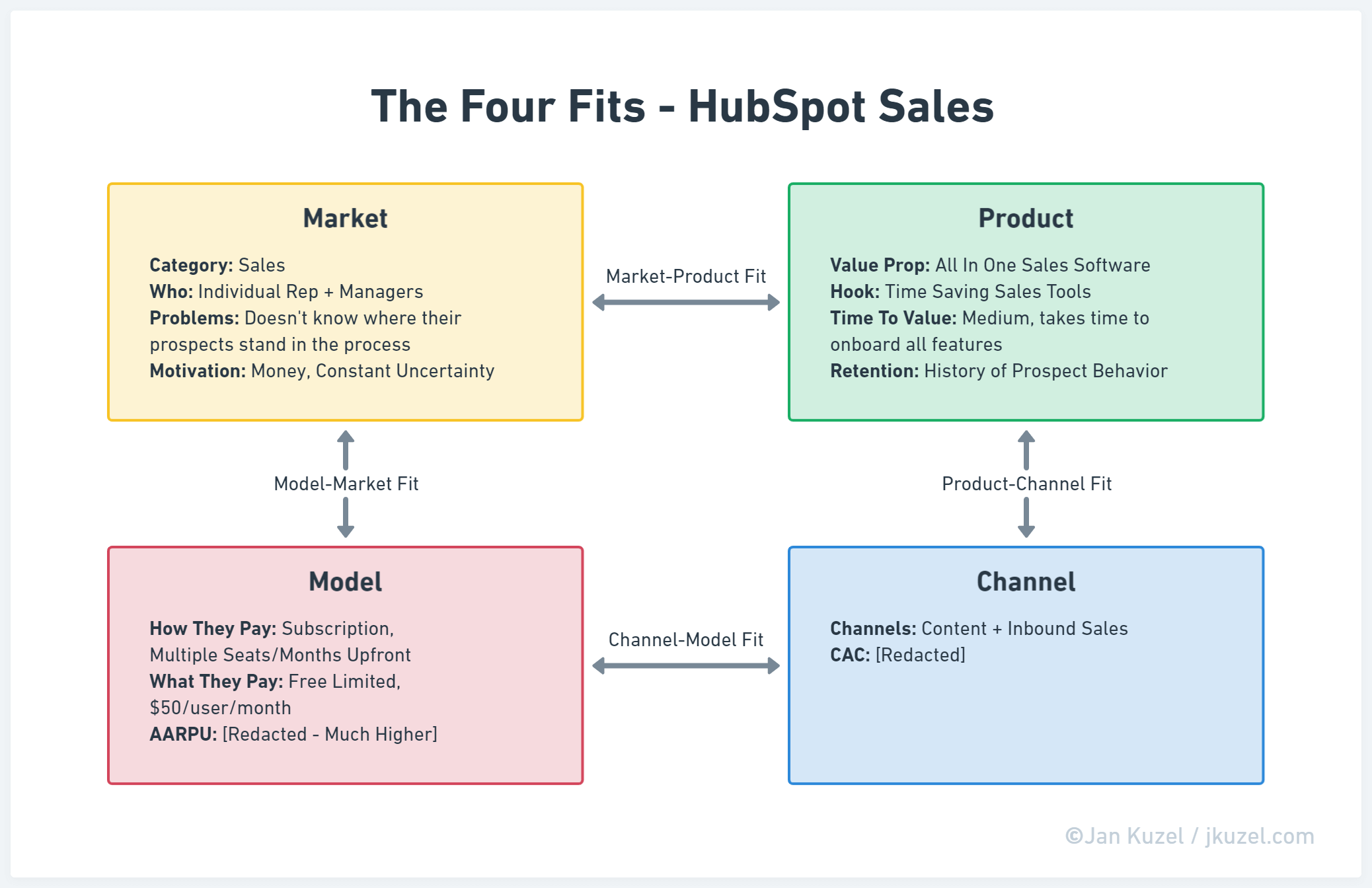 The Four Fits are a bit similar to The Positioning framework, but they are more extensive with details of channels used, the pricing model chosen, and the compatibility of all these. The best explanation is provided in the video case study that unpacks the Four Fits through the lens of HubSpot's success story.